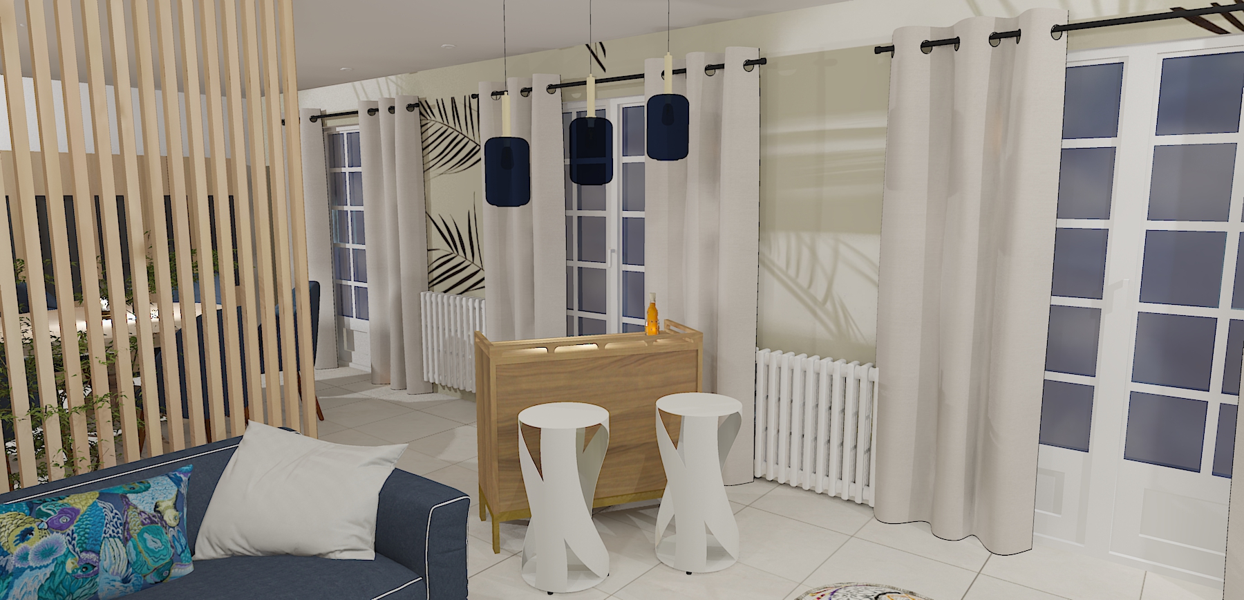 La mise en place d’un claustra a permis la hiérarchisation des espaces : entrée, salle à manger, séjour. Cette nouvelle distribution de l’espace a gommé l’aspect « traversant » du lieu.
